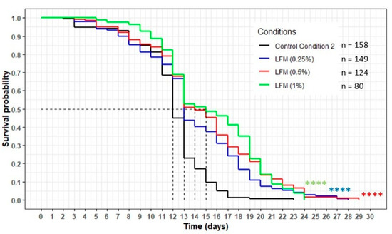 The worms incubated with the lipid-free milk (LFM) presented a significant increase in their lifespan compared with the CC2 condition, with the curves of each concentration of the extract above the CC2 curve (p < 0.0001) (Figure 11). The mean lifespan increased by 8%, 17% and 25% for the 0.25%, 0.5% and 1% concentrations, respectively (Table 8). The maximum lifespan increased between 4% and 26%, and the percentage of the population still alive when the worms on the CC2 condition had died was between 5% and 7%.