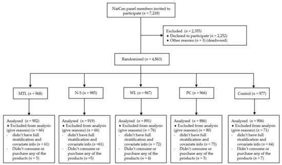 Of the 7218 panel members contacted, 4863 agreed to participate (67% response rate) and were randomly allocated to: MTL (n = 968), N-S (n = 985), WL (n = 967), PC (n = 966) and control (n = 977). See CONSORT flowchart for more detail (Figure 2). The average time taken to complete the online survey was 13 min (SD 8 min), not including demographic data routinely collected by NatCen. Complete stratification and covariate information was available for 4530 participants, of which 4504 were included in this analysis. The number of missing data for the primary outcomes was very low (≤2% missing per variable, see Table S4 in the Supplementary File). The sample for each product category analysis differed slightly as inclusion was dependent on consuming/purchasing that specific product (see Tables S6–S8 in the Supplementary File for the sensitivity analyses using the full 4530 sample, results were consistent with the main analyses). The global food score sample was 1976, as inclusion was dependent on participants consuming/purchasing all five food products.