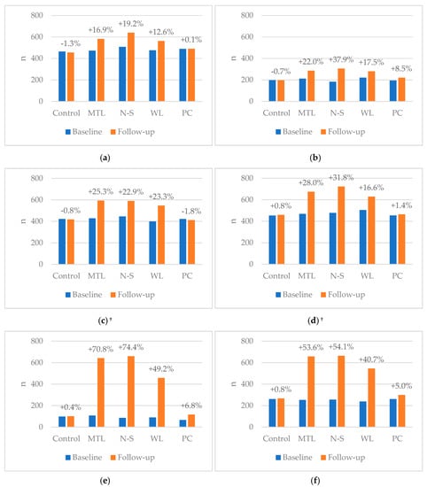 Number of participants who correctly ranked products at baseline and follow-up, by FOPL group and product category: (a) Pizza; (b) Drink; (c) Cake; (d) Crisps; (e) Yoghurt; (f) Breakfast cereal. † Cake and crisps categories had no products qualify for Positive Choice tick. MTL: Multiple Traffic Lights; N-S: Nutri-Score; WL: Warning label; PC: Positive Choice tick.