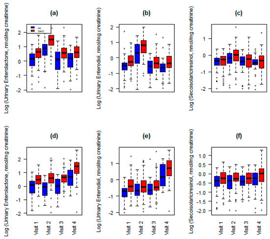 Urinary lignan excretion by ethnicity, randomization group, and visit are shown in Figure 1. Figure 1a–c represent participants in group 1 who received FS during the first 6 weeks of the study. As expected, excretion increased between visits 1 and 2 in response to FS consumption for ENL (Figure 1a; p < 0.001, AA and EA), ED (Figure 1b; p < 0.001, AA and EA), and SECO (Figure 1c; p = 0.0069 and p < 0.0001, AA and EA, respectively). Figure 1d–f represent participants in group 2 who received FS during the last 6 weeks of the study. Similar to the effects observed in group 1, excretion increased between visits 3 and 4 in response to FS consumption for ENL (Figure 1d; p < 0.001, AA and EA), ED (Figure 1e; p < 0.001, AA and EA), and SECO (Figure 1f; p = 0.17 and p = 0.0048, AA and EA, respectively). Interestingly, at each time point, excretion was higher among EA compared to AA: ENL (p < 0.0001, group 1 and 2), ED (p < 0.001, group 1 and 2) and SECO (p < 0.001 and p = 0.0024, group 1 and 2, respectively).