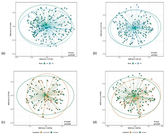 Beta diversity by ethnicity stratified by intervention status and by intervention status stratified by ethnicity. (a) shows beta diversity by ethnicity at baseline; (b) shows beta diversity by ethnicity after flaxseed (FS) intervention; (c) shows beta diversity by intervention status among women of African ancestry (AA); (d) shows beta diversity by intervention status among women of European ancestry (EA). Community structure differs by ethnicity at baseline (Figure 2a; p = 0.0106), but not after FS intervention (Figure 2b; p = 0.2044). A small amount of variation in community structure is explained by ethnicity differences (Figure 2a, R2 = 0.01 and Figure 2b, R2 = 0.007). Community structure does not differ significantly by intervention status for AA (Figure 2c) or EA (Figure 2d) women.