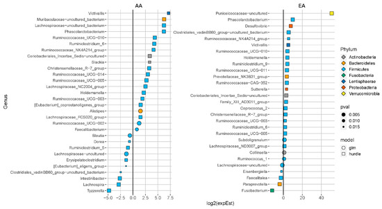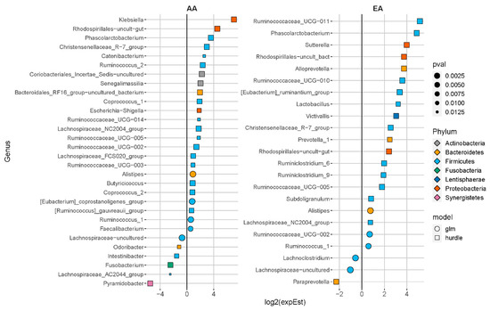 Differentially abundant genera associated with enterolactone excretion at baseline in women of African ancestry (AA) and European ancestry (EA); adj p < 0.05. Genera with less than 1% zeros across samples were fit with a negative-binomial generalized linear model (GLM) otherwise, a hurdle model was used. Models were adjusted for baseline age, body mass index (kg/m2), total dietary fiber (g/d), energy intake (kcal/d), and total flaxseed consumption during the intervention period (g).
