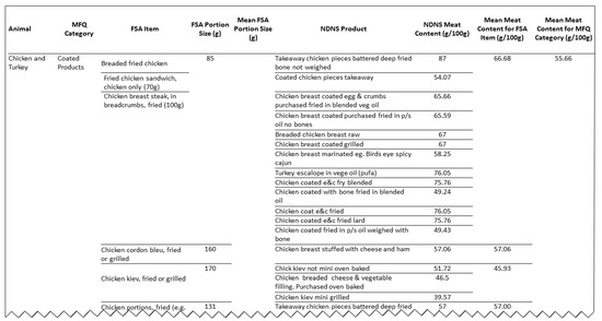 (iv) We calculated mean portion sizes for each MFQ category based on FSA portion size data to provide a single serving size. The mean meat content was first calculated for each FSA item, and then across all items in an MFQ category. To calculate the grams of meat per serving for each MFQ category, the mean serving size for the category was multiplied with its respective mean meat content. Figure 1 shows an excerpt of the extracted data for the chicken and turkey category. The MFQ and its underlying meat proportions are available in Supplementary File S2.