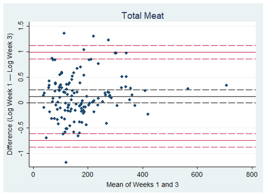 The test–retest reliability of the mean total daily meat intake was assessed through ICC, using absolute-agreement and single rater two-way random models [17]. This type of ICC analysis allowed us to generalize the findings to a wider population of ‘raters’, i.e., UK residents with similar demographic characteristics to our sample. ICC values were interpreted as follows: ≤0.20 = poor agreement, 0.21–0.40 = fair agreement, 0.41–0.60 = moderate agreement, 0.61–0.80 = good agreement, and >0.81 = excellent agreement [18,19]. We created Bland-Altman plots to visualize the test–retest reliability, based on the mean difference and 95% limits of agreement (LOA) of the two measures [20]. The Bland-Altman plots were created using log-transformed difference data because the differences between weeks were not normally distributed and a strong magnitude bias existed between means and differences of the two weeks [21]. Linear regressions on the log-transformed difference data were employed to assess the relationship between the bias and magnitude of the measurement [21].