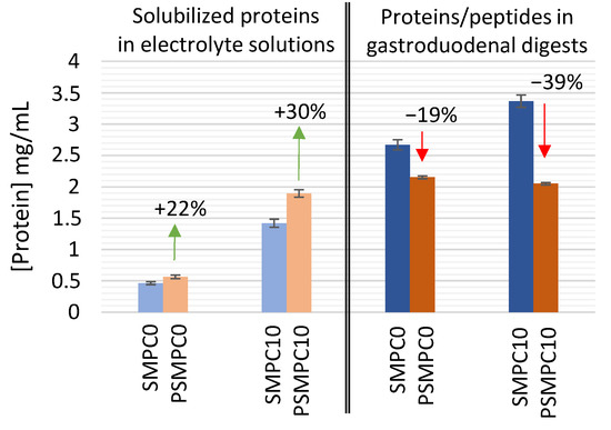 In particular, focusing on the undigested set of samples (first four columns of Figure 1), it was observed that the autoclave-based treatment increased the protein solubility by 22% in milk-free model sausages (SMPC0 vs. PSMPC0), and up to 30% in model sausages fortified with MPC (SMPC10 vs. PSMPC10). This experimental evidence suggested that the exogenous milk proteins were even more susceptible to the technological process than the meat proteins themselves. It could be hypothesized that the combination of pressure and temperature, typical of autoclaving, promotes a displacement of matrix components, leading to a modification of protein status toward a more soluble form in the processed matrix [33,34].