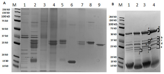 - Laemmli, U.K. Cleavage of structural proteins during the assembly of the head of bacteriophage T4. Nature 1970, 227, 680–685. [Google Scholar] [CrossRef]