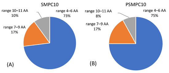 Overview of peptide distribution across three groups differing for sequence length (ranges: 4–6 amino acid (AA), 7–8 AA, 9–11 AA) and detected in digested (A) SMPC10 and (B) PSMPC10 model sausages.