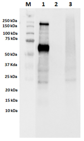 Immunoblot of undigested raw and autoclaved model sausages. Legend: lane 1, SMPC10; lane 2, PSMPC0; lane 3, PSMPC10; M, Precision Plus Protein™ All Blue Standard (10–250 kDa, Bio-Rad Laboratories, Segrate, Milan, Italy). The immunoblot was carried out on a pool of sera of patients allergic to cow’s milk.