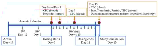 Study timeline. CBC: Complete blood count included measurement of hemoglobin, mean corpuscular volume, hematocrit and hemogram; BW: Body weight; TIBC: Total iron binding capacity.