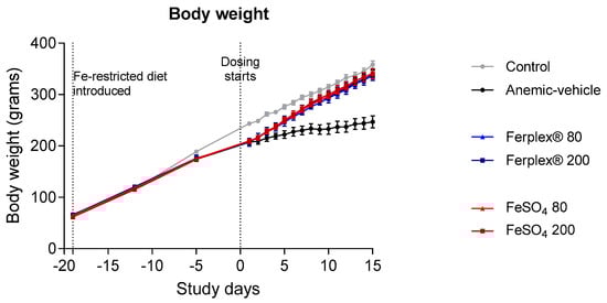 Body weight monitoring during anemia induction and treatment period. Weights were monitored daily from day 0 to day 14, when the study was terminated. Data are presented as mean ± SEM. No significant difference was found between treatment groups (Ferplex® versus FeSO4) or between the 80 vs. 200 mg doses. No statistical difference was found between treatment groups and control at study termination. Data were analyzed by means of a Kruskal-Wallis test and with Dunnett’s multiple comparison test. N = 6 (anemic-vehicle and Ferplex 200 at day 15), 7 (FeSO4 80 and 200), 8 (control and Ferplex® 80).