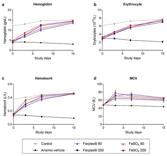Complete blood count monitored during the treatment period. (a) Hemoglobin, (b) erythrocyte count (c) hematocrit and (d) mean corpuscular volume (MCV) measured in blood samples on days 0, 3, and 7 and at study termination on day 15. Data are presented as mean ± SEM. No significant difference was observed between treatment groups (Ferplex® versus FeSO4) and doses. Neither was any significant difference detected between treatment groups at any time point. At termination there was no significant difference between treatment groups and control. Data were analyzed by means of a Kruskal-Wallis test followed by Dunnett’s multiple comparison test. N = 5–8.