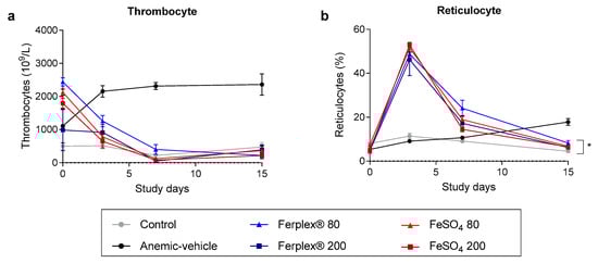Cell populations affected by anemia during the treatment period. (a) The number of thrombocytes and (b) Reticulocyte percentage was recorded in blood samples on days 0, 3, and 7 and at study termination on day 15. Data are presented as mean ± SEM. There was no significant difference between treatment groups at any time point. * p < 0.05 Ferplex® 80 mg as compared with the control group on day 15 with a Kruskal-Wallis test followed by Dunnett’s multiple comparison test. N = 5–8.