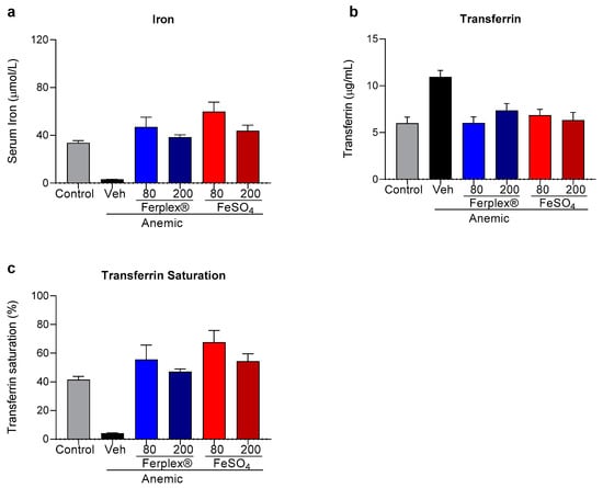 The biochemical markers of anemia were analyzed in the serum samples collected at study termination. As expected, iron content was significantly lower in the anemic-vehicle rats, in which the deficiency was compensated by an increase in transferrin concentration (Figure 5a,b). Both treatments, Ferplex® and FeSO4, completely restored physiological concentrations of both parameters. The anemia also induced a drop in saturated transferrin concentration, which was recovered similarly by Ferplex® and FeSO4 (Figure 5c). In these three biochemical parameters, concentrations were restored to similar levels regardless of the dose at study termination.