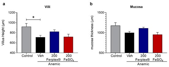 Histological HE analysis of villi (a) and mucosa (b) height in duodenal samples. Data are presented as individual points and mean ± SEM. * p < 0.05 with the Kruskal-Wallis test followed by Dunnett’s multiple comparison test. N = 6 (anemic-vehicle); 8 (control); 7 (treatment groups). Veh = vehicle.