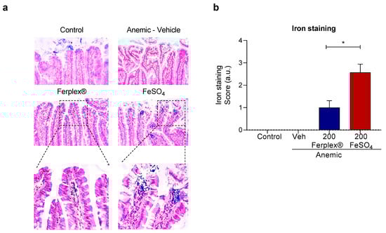 Histological analysis of iron deposition. (a) Representative image of Prussian blue staining of the duodenal sample, showing localization of blue iron staining in the lamina propria at 200x magnification. (b) Quantification of iron deposition as a score of non-luminal iron staining. * p < 0.05 with the Mann-Whitney test. N = 6 (anemic-vehicle); 8 (control); 7 (treatment groups). Veh = vehicle.