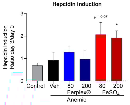 Hepcidin induction calculated as the ratio between the concentration of serum hepcidin measured in serum on day 3 and on day 0 of the treatment via an ELISA assay. * p < 0.05, as compared with the control group by means of a Kruskal-Wallis test, followed by Dunnett’s multiple comparison test. N = 5 (FeSO4 200); 7 (control); 8 (Ferplex® 80); 6 (remaining groups). Veh = vehicle.