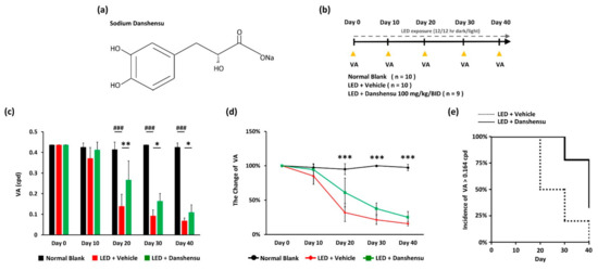 Effect of danshensu on light-evoked visual acuity (VA) deterioration. (a) Chemical structure of sodium danshensu; (b) Timeline of experimental design; (c) Representation of the VA threshold. Data are mean ± SE. Mann-Whitney U test. ### p < 0.001, compared with the blank group. ** p < 0.01, and * p < 0.05, compared with the vehicle group; (d) Relative change in VA. Data are mean ± SE. Kruskal–Wallis test. *** p < 0.001; (e) Incidence rate of VA > 0.164 cpd.