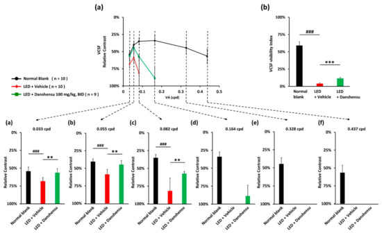 Protection of low spatial frequency-based visual contrast sensitivity function (VCSF) by danshensu treatment. (a) Representation of the inverted U-shape diagram of VCSF curve; (b) VCSF visibility index. Individual threshold with details represented in 0.033 cpd (a), 0.055 cpd (b), 0.082 cpd (c), 0.164 cpd (d), 0.328 cpd (e), and 0.437 cpd (f). Data are mean ± SD, Mann–Whitney U test, N.S., non-significant. ### p < 0.001, compared with the blank group. *** p < 0.001, and ** p < 0.01, compared with the vehicle group.