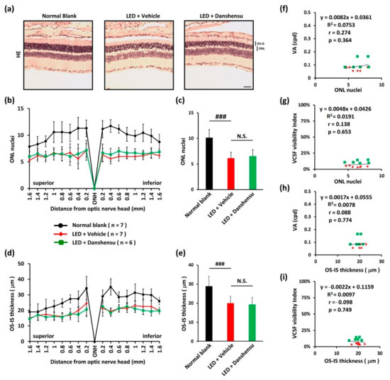 We assessed the loss of photoreceptors through histopathologic microscopic examination of the whole retina on day 40 (Figure 3a). The loss of photoreceptor nuclei in ONL (Figure 3b,c) and OS-IS did not differ significantly in the danshensu group from that in the retinas of the vehicle group (Figure 3d,e), indicating no effect of danshensu on light-evoked tissue damage to retinas. Moreover, the morphology of the residual ONL or OS-IS was not correlated with the residual threshold of VA or VCSF (Figure 3f–i).