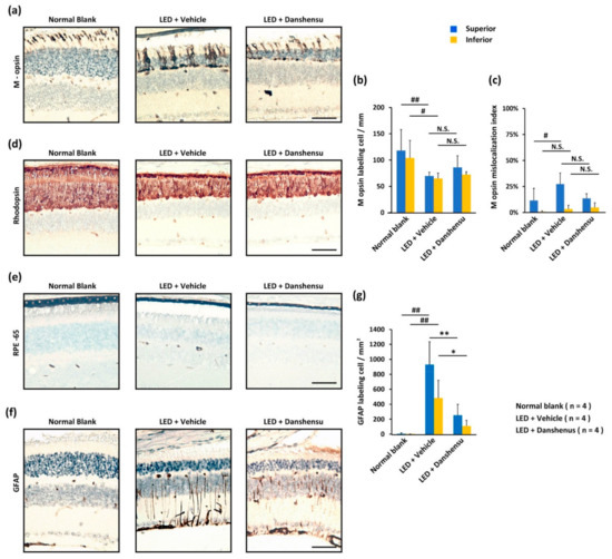 In particular, a thinner change in the RPE65-labeled pigmented layer was observed in the retinas of the danshensu and vehicle group compared to the blank group (Figure 4e). Light-evoked Müller cell gliosis was detected by GFAP staining, whereas characteristic changes subsequently leading to dystrophies in retinas have been well documented. Danshensu prevented Müller cell gliosis (Figure 4f), which significantly reduced GFAP labeling in cells compared to the vehicle group (Figure 4g) with significant differences in both superior retinas (p < 0.01) and inferior retinas (p < 0.05) (Figure 4g). These results indicated that the pigmented layer and Müller cells might alternatively serve as protective targets of danshensu compared to photoreceptors in retinas.