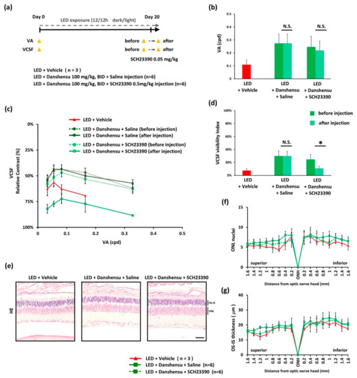 Effect of danshensu on the modulation of dopamine receptor to improve VCSF. (a) Timeline of experimental design; (b) Representation of the change in VA threshold; (c) Change in VCSF threshold; (d) Change in VCSF visibility index after dopamine D1 receptor antagonist (SCH 23390) injection; (e) Representation of the absence of difference after H&E staining; (f) Residual thickness of ONL (g) and OS-IS after SCH 23390 injection. Data are expressed as mean ± SE. Mann–Whitney U test, N.S., non-significant. * p < 0.05, compared with the vehicle group. Scale bar: 35 μm.