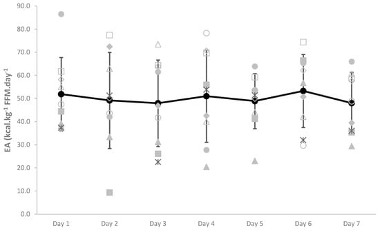 No female participants were found to have low EA according to AB EA cutoff values (<30 kcal·kg−1 FFM·day−1), while three participants were considered to have moderate EA (30–45 kcal·kg−1 FFM·day−1). However, large daily fluctuations in EA existed (21.6% CV), with some participants displaying LEA within the 7 days (Figure 1).