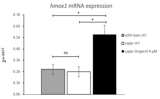 Quantitative real-time PCR analysis of hmox1 mRNA in untreated (wild-type (WT) n = 75; sapje CTRL, n = 75) and in treated (gingerol 4 µM, n = 75) homozygous sapje larvae. The error bars show the standard error of the mean (SEM). * p ≤ 0.05, ns p > 0.05.