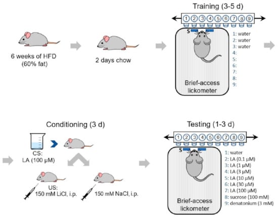 Conditioned taste aversion paradigm. Following 6 weeks of high-fat diet (HFD) (60%), the mice underwent the following conditioning paradigm. The mice were trained to lick from a Davis rig for 3–5 days prior to conditioning using water until they consistently licked the bottle during a 5 s interval. On conditioning days, mice were given free access to the unconditioned stimulus (100 µM linoleic acid (LA)) prior to an intraperitoneal injection of either 150 mM NaCl or LiCl (conditioned stimulus; 127 mg/kg). Mice in the LiCl treatment group were observed post-injection for signs of gastric distress. During testing days, mice were given access to LA at concentrations of 0.1, 1, 3, 10, 30, and 100 µM; 100 mM sucrose; 3 mM denatonium benzoate; and water in a randomized sequence. Mice had access to test solutions for 5 s followed by a rinse solution (water) for 2 s before presentation of the next test solution.