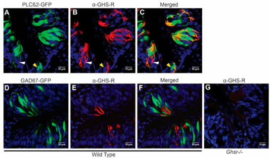Growth hormone secretagogue receptor (GHS-R) is expressed in type II but rarely in type III taste cells of circumvallate papillae. (A–C) PLCβ2-GFP, green; anti-GHS-R, red; and merged images, respectively. In (C), the yellow arrow points to a representative taste cell that expresses PLCβ2 but not GHS-R, and the white arrow highlights a PLCβ2-negative, GHS-R-positive taste cell. (D–F) GAD67-GFP, green; anti-GHS-R, red; and merged images, respectively. (G) Anti-GHS-R antibody incubated on a representative section of circumvallate papillae from a GHS-R-deficient mouse (negative control). Nuclear staining is shown in blue in all figures.
