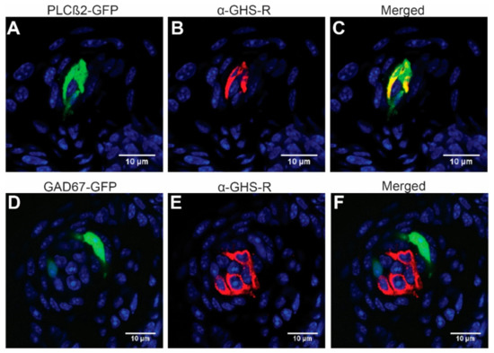 GHS-R is expressed in type II but rarely in type III taste cells of the fungiform papillae. (A–C) PLCβ2-GFP, green; anti-GHS-R, red; and merged images, respectively. (D–F) GAD67-GFP, green; anti-GHS-R, red; and merged images, respectively.