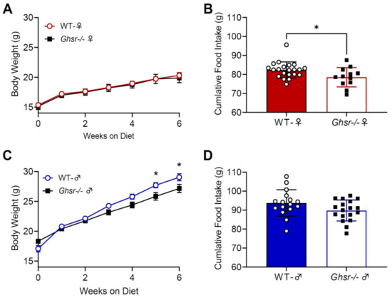 Body weight and food intake in wild-type (WT) and GHS-R-deficient mice on a high-fat diet. While not showing a significant difference in body weight (A), Ghsr−/− females consumed less compared to WT females (B). Alternatively, male Ghsr−/− mice (C,D) showed a decrease in body weight by week 5 of the HFD and no significant differences in food intake compared to their WT counterparts.* p-value < 0.05.