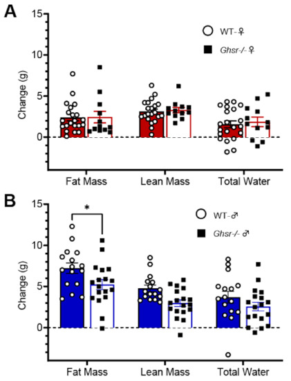 Body composition changes in WT and Ghsr−/− mice on a high-fat diet. Changes in body compositions calculated from data collected before the HFD and after 6 weeks of the HFD. (A). No significant changes in body composition were found in WT and Ghsr−/− females on 6 weeks of the HFD. (B). WT males gained more fat mass on 6 weeks of HFD compared to Ghsr−/− males.* p-value < 0.05.