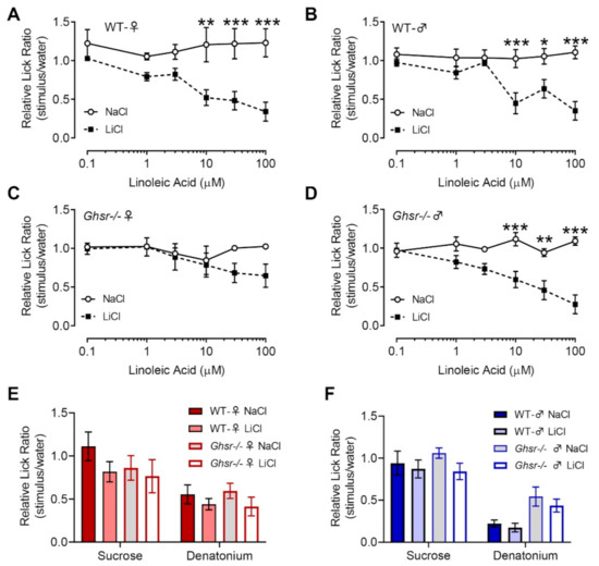 Linoleic acid responsiveness assessed in a conditioned taste aversion assay showed changes in Ghsr−/− female mice. (A). WT female mice (n = 15) revealed a significant aversion to LA at 10 µM, similar to that seen in WT males (n = 15) (B). Ghsr−/− females (n = 11) showed no significant differences in the LiCl compared to the NaCl group across all concentrations of LA (C). Male mice lacking GHS-R (n = 18) showed aversion at 10 µM LA, similar to WT mice (D). WT and Ghsr−/− females (E) and males (F) exhibited similar lick ratios to the control solutions, sucrose (100 mM), and denatonium benzoate (3 mM). * p-value < 0.05, ** p-value ≤ 0.01, and *** p-value < 0.0001.