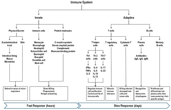 The adaptive system includes antigen-specific cells, namely B and T lymphocytes, with the former secreting antibodies specific to the infecting agents for humoral immunity and the latter with T helper [(Th) bearing CD4 receptor] cells coordinating the overall adaptive response, with cytotoxic T [(Tc) bearing CD8 receptor] cells killing virally-infected damaged host cells and tumor cells, and with T regulatory cells (Treg) being vital in maintaining immune tolerance to allow the immune system to ignore non-harmful non-self-substances (such as food, pollen, and environmental antigens) [6,13]. Intracellular fragments generated from phagocytosis of pathogens stimulate Tc cells and extracellular pathogens stimulate Th cells. The Th cells can be further categorized into three subtypes, defined by the cytokines they produce. Th1 cells produce interferon-gamma (IFN-γ), tumor necrosis factor-α (TNF-α), and interleukin (IL)-2 and play a crucial role in antiviral and cellular immune responses, Th2 cells produce IL-4, -5, -10, and -13 and are involved in humoral (antibody), anti-parasitic, allergic responses [17] and Th17 cells secrete IL-17A, IL-17F, and IL-22 and contribute to fighting extracellular pathogens [6,18]. After binding, cytokines can regulate growth, development or activity of the target cells. For example, TNF-α, IL-1 and IL-6 regulate monocytes and macrophages, stimulate acute phase protein synthesis in the liver, and suppress appetite [14]. B lymphocytes differentiate into plasma cells, producing a variety of antibodies, immunoglobulins (Igs), which facilitate recognition and destruction of pathogens [19]. For example, IgA present in the mucosal surface protects against bacterial and viral infections. Although slow at first when encountering a microorganism for the first time, the adaptive immunity response is faster and stronger than the initial response when the microorganism is encountered again (i.e., there is re-infection) as it draws from its immunological memory from prior exposure to the antigenic components of the microorganism. When an antigen binds to the small number of activated lymphocytes that recognize it, it can stimulate lymphocytes clonal division, increasing the immune response to the antigen, a process termed lymphocyte expansion or proliferation. This memory mechanism also supports the effectiveness of vaccination against subsequent pathogen exposure [13].