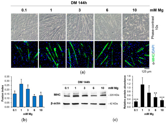 After 144 h of differentiation in low (0.1 mM), physiological (1 mM), and high (3, 6, and 10 mM) Mg concentrations, we analyzed C2C12 cells by optical microscope and by immunofluorescence using antibodies against Myosin Heavy Chain (MHC), a contractile protein only expressed in differentiated myotubes. As shown in Figure 1, we detected a significant reduction in the number of myotubes (Figure 1a) and in the fusion index values (nuclei in myotubes vs. total nuclei) (Figure 1b) both in low and high extracellular Mg vs. the control cells differentiated in physiological Mg concentrations. By Western blot (Figure 1c), we confirmed the reduction of the MHC expression in low and high Mg, suggesting that non-physiological extracellular concentrations of Mg impair myogenesis.