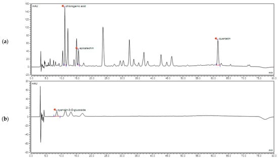 Analysis was performed on (Thermo Scientific UltiMate 3000 UHPLC) system equipped with UV detector. Zorbax Eclipse Plus C18 column (100 × 4.6 mm, 3.5 μm) was used. The mobile phase consisted of acetonitrile (A) and 0.1% formic acid (B). The linear gradient profile was as follows: 10–20% (A) for 45 min, 20–30% (A) for 15 min, 30–40% (A) for 10 min, and 40–10% for 10 min. The flow rate of mobile phase was set at 0.8 mL/min, the temperature was 40 °C. The detection wavelength was 240, 254, 270, and 520 nm. The identification of each compound was carried out by the comparison of both retention time and UV-VIS spectra of reference compound. Epicatechin and cyanidin-3-O-glucoside, analytical standards were obtained from ChromaDex. Quercetin (purity ≥ 95%) and chlorogenic acid (purity 96.6%) were purchased from Sigma-Aldrich and Dr. Ehrenstorfer GmbH respectively.