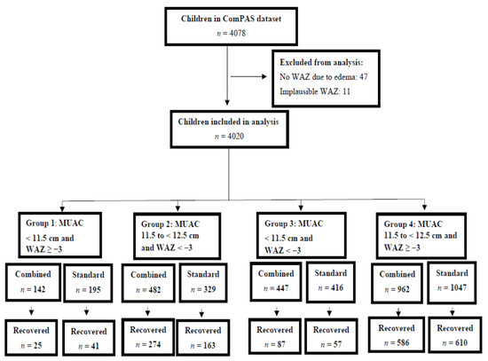 Analysis flow chart. MUAC, mid-upper arm circumference; WAZ, weight-for-age z-score.