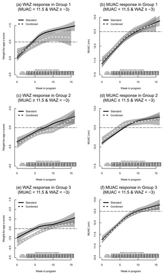Panel of WAZ and MUAC response among recovered children by admission group. MUAC, mid-upper arm circumference; WAZ, weight-for-age z-score. (a) WAZ plotted against week in program for Group 1; (b) MUAC plotted against week in program for Group 1; (c) WAZ plotted against week in program for Group 2; (d) MUAC plotted against week in program for Group 2; (e) WAZ plotted against week in program for Group 3; (f) MUAC plotted against week in program for Group 3. The shaded areas represent a 95% confidence band around each curve (i.e., the area between the upper and lower 95% confidence limits is shaded). Overlaps between confidence intervals are more darkly shaded.