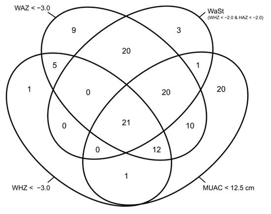 Venn diagram showing the number of deaths among treated children with different combinations of anthropometric deficits (adapted from Myatt et al., 2019 [19]). MUAC, mid-upper arm circumference; WAZ, weight-for-age z-score; WHZ, weight-for-height z-score; HAZ, height-for-age z-score; WaSt, both wasted and stunted.