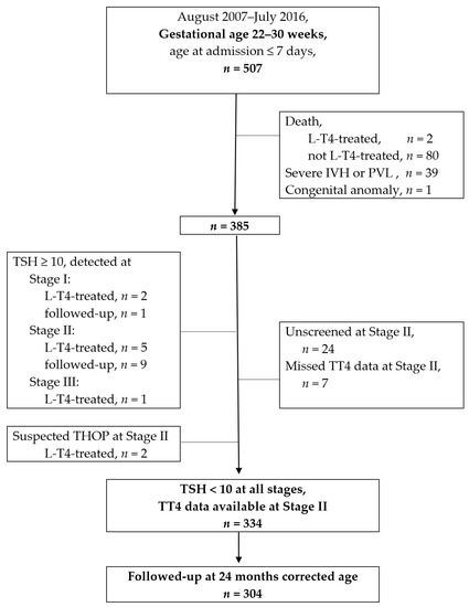 Flow chart of patient enrollments. L-T4: levothyroxine; IVH: intraventricular hemorrhage; PVL: periventricular leukomalacia; TSH: thyroid-stimulating hormone (unit: μIU/mL); TT4: total serum thyroxin; THOP: transient hypothyroidism of prematurity; a detailed description of the stages presented in the methodology, Section 2.2.