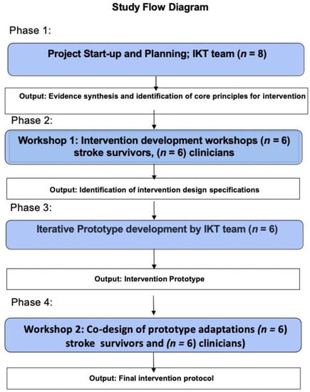 - Ramage, E.R.; Burke, M.; Galloway, M.; Janssen, H.; Lynch, E.A.; Marsden, D.L.; Patterson, A.J.; Said, V.M.; English, C. An integrated knowledge translation approach to co-design a complex exercise intervention for stroke survivors: A case report. In How We Work Together: The Integrated Knowledge Translation Research Network Casebook; Boland, L., Reszel, J., McCutcheon, C., Kothari, A., Graham, I.D., Eds.; Integrated Knowledge Translation Research Network: Ottawa, ON, Canada, 2020; Volume 3, pp. 13–18. [Google Scholar]
