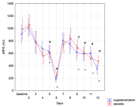 The changes of session Rating of Perceived Exertion (sRPE) during training in group with supplementation and with placebo (* significant change (p < 0.05) to baseline in placebo group; # significant change (p < 0.05) to baseline in supplement group).