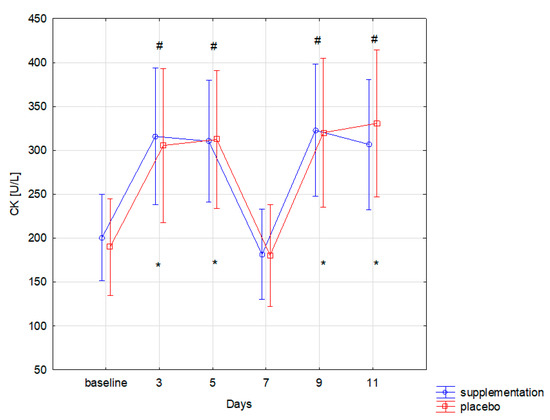 Creatine kinase (CK) concentration in subsequent days in supplements (SUP) and placebo (PL) groups (* significant change (p < 0.05) to baseline in PL group; # significant change (p < 0.05) to baseline in SUP group).