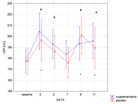 Lactate dehydrogenase (LDH) concentration in subsequent days in SUP and PL groups (* significant change (p < 0.05) to baseline in PL group; # significant change (p < 0.05) to baseline in SUP group).