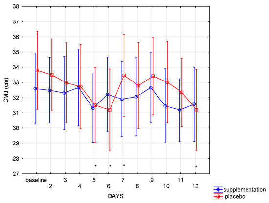 The changes in CMJ height in the analyzed period were particularly interesting—there were no differences between SUP and PL groups in CMJ (f = 0.14, p = 0.70). However, in both groups, the changes in the CMJ height proceeded differently (interaction group × days: f = 1.92, p = 0.04). Post hoc analysis showed that in the supplement group, no significant differences (p > 0.05) were noted between subsequent days. On the last day of training, the CMJ height was close to the baseline. In contrast, in the placebo group, the CMJ height changes were statistically significant: decrease in CMJ height (p = 0.002) was noted between the baseline and the 6th day. At the same time, a considerable increase in CMJ height (p = 0.02) between the 6th and the 7th measurement was also recorded. On the last day, a significant (p = 0.002) decrease in the CMJ height was observed in the placebo group compared to the baseline measurement. There were no such changes registered in the SUP group (Figure 4).
