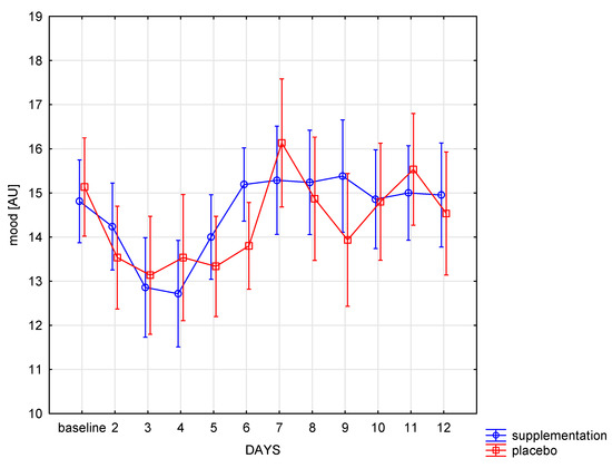 The well-being changed significantly during the training period in both groups (f = 6.62, p < 0.001), and the intergroup mood differences were similar (f = 0.12, p = 0.73). Significant (p < 0.05) improvement in well-being in the SUP group was noted between the 3rd day, 6th, 7th, 8th, and 9th day and between 4 and subsequent days of training. Afterwards, the well-being did not change until the end of the camp. In the placebo group, significant (p < 0.05) improvement in well-being was shown only after day 7 compared to the previous days (days 2–6) (Figure 5). In the following days, no significant changes were observed in both groups.