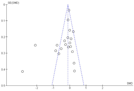 Twenty studies including 5836 individuals were included in the analyses. Results are reported as standardized mean difference (95% CI) and showed that n-3 PUFA supplementation lowered depressive symptomology as compared to placebo: SMD = −0.34, 95% CI: −0.55, −0.12. However, there was substantial heterogeneity between studies (I2 = 86%). The effect sizes were small or modest (Figure 2). Asymmetries in the funnel plot (Figure 3) suggest that results might be influenced by biasing factors such as publication bias. Two studies are particularly responsible for this asymmetry [26,27] as they showed the strongest beneficial effects of supplemental n-3 PUFA intake.