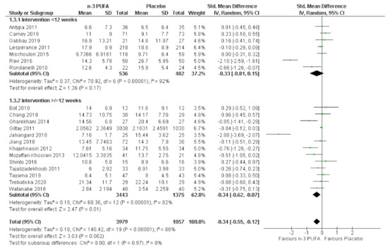 A recent meta-analysis assumed that beneficial effects may only occur after long-term supplementation and excluded RCTs of less than 6 months duration [17]. In our study, beneficial effects of n-3 PUFAs were observed in the subgroup of studies with longer treatment duration of ≥12 weeks (SMD = −0.34, 95% CI: −0.62, −0.07, I2 = 82%), as well as in studies with treatment durations <12 weeks (SMD = −0.33, 95% CI: −0.81, 0.15, I2 = 92%), although, in the latter group, these effects were not statistically significant. There was considerable heterogeneity in both subgroups that requires further exploration. There was, however, no evidence for a statistically significant difference between treatment duration subgroups (chi2 = 0.00, df = 1, p = 0.97, I2 = 0%; see Figure 4).