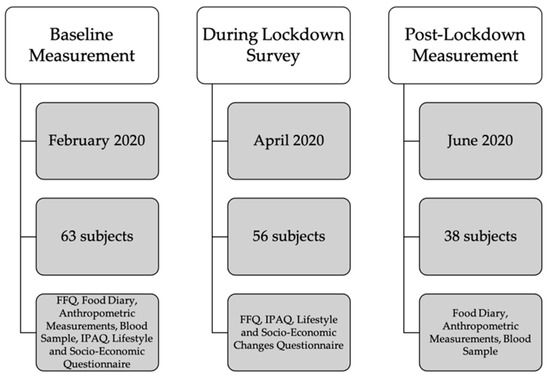Baseline measurement (anthropometric measurements, blood sample, Food frequency questionnaire (FFQ), 3-day Food Diary, Lifestyle Questionnaire, International Physical Activity Questionnaire (IPAQ), Socio-Economic Questionnaire) took place in January, February and the beginning of March 2020 and was then interrupted due to the COVID-19 lockdown. After 4 weeks of lockdown, we invited all subjects with completed baseline measurement to participate in a survey on the effects of lockdown on their lifestyle (FFQ, IPAQ, Lifestyle and Socio-economic Changes Questionnaire). In the beginning of June 2020, they were invited to participate in a post-lockdown measurement (anthropometric measurements, blood sample, 3-day Food diary). All subjects were subjected to the same quarantine rules determined for the whole Slovene population that severely limited individual mobility, obliged everybody to work from home or refrain from work except from certain jobs, listed in the law as exceptions due to their importance for national security. Figure 1 shows the study design.