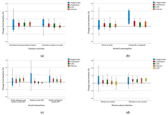 (a) Δ serum markers in groups with different outdoor activities during lockdown; (b) Δ serum markers in groups with different alcohol consumption during lockdown; (c) Δ serum markers in groups with different social interactions during lockdown; (d) Δ serum markers in groups with different levels of worries about infection during lockdown. Δ—change of post-lockdown value from baseline; LDL—low-density lipoprotein; AST—aspartate transaminase; HH—household. * p < 0.05 is considered statistically significant.